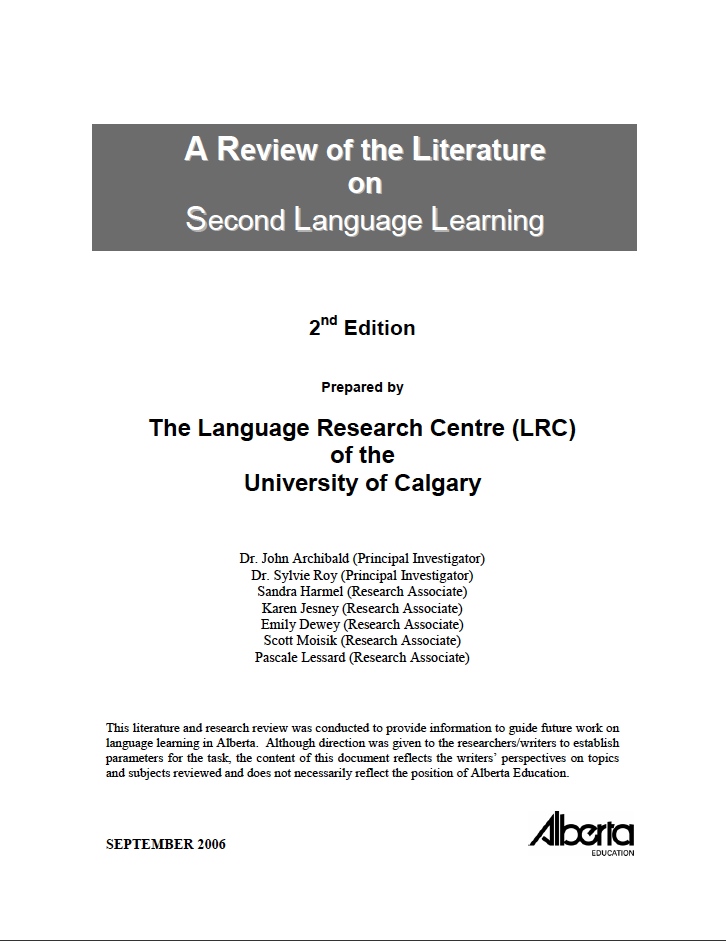 Written Dr. John Archibald, Dr. Sylvie Roy and other researchers at from the Language Research Centre (LRC), of the University of Calgary, A Review of the Literature on Second Language Learning, 2nd ed. Published in 2006, this study examines 4 key areas: