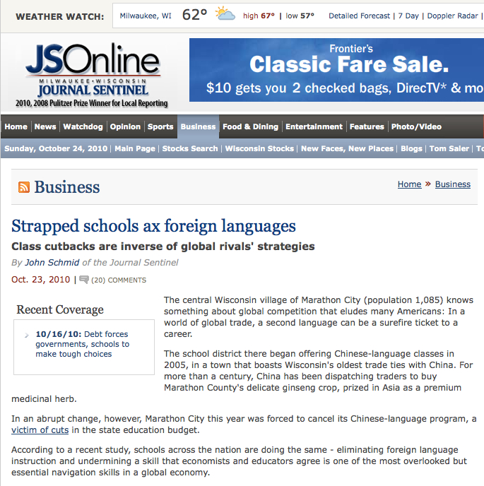 Strapped Schools Ax Foreign Language Programs – Milwaukee – Wisconsin Journal Sentinel, by John Schmid, October 23, 2010