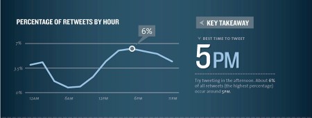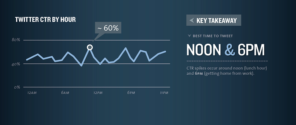 If your purpose isn’t to be re-Tweeted, but rather to have followers click on your links, the statistics change a bit. The report says that the highest click through rate (CTR) is noon and 6:00 p.m., Eastern time.