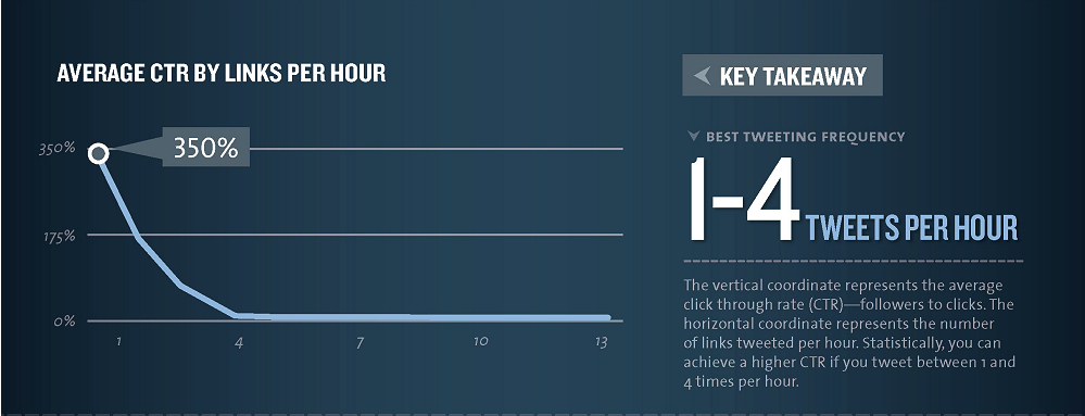 How often should you Tweet if you want people to click through to your links? Survey says… 1 to 4 times per hour. The click through rate (CTR) is apparently highest for those who Tweet their links every 15 to 60 minutes. If you tweet links more than 4 times per hour, your followers are likely to become numbed to your barage of Tweets. Personally, I never Tweet with links that much. I guess I need to start Tweeting more!