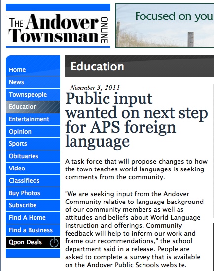 One comment posted on the Andover news article pointed out that the survey is an imperfect tool, since respondents can answer as many times as they like, potentially skewing the results. This is relatively easy to overcome, depending on which survey tool is used. Nevertheless, the concept is brilliant. Opening up discussions about education and in particular, language learning, to the public and ultimately involving the community in the decision making process is innovative, respectful of the community and downright brilliant.