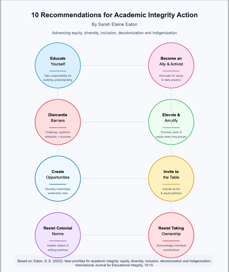 Eaton, S. E. (2022). New priorities for academic integrity: equity, diversity, inclusion, decolonization and Indigenization. International Journal for Educational Integrity, 1-12. https://doi.org/10.1007/s40979-022-00105-0