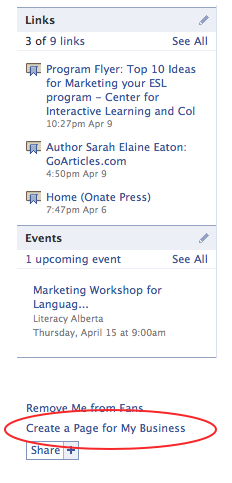 I’m not offering that up as shameless self-promotion, but rather to make it easy for you. On the bottom left hand side of the page there’s a link that says, “Create a page for my business”. Click on it. Make a page for your school.